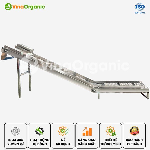 • Băng tải được làm từ inox 304 cao cấp, sáng bóng, đảm bảo vệ sinh an toàn thực phẩm.