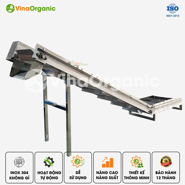 Băng tải hứng liệu VinaOrganic được thiết kế thông minh, khi kết hợp với máy ly tâm xả đáy VinaOrganic giúp toàn bộ quá trình ly tâm sản phẩm diễn ra tự động và đạt hiệu quả nhất. Máy thiết bị có cấu tạo chính gồm các bộ phận sau: khung băng chuyền, lưới inox, thanh gờ chắn, động cơ, chân đứng, tủ điều khiển.