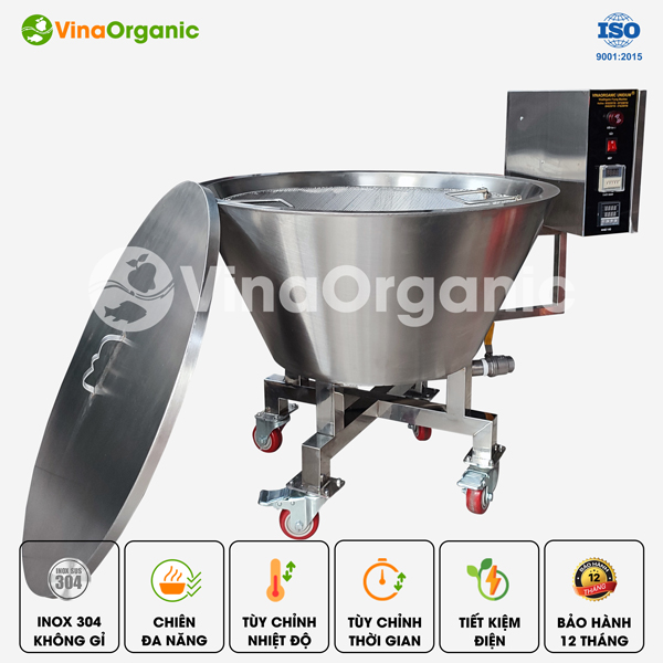 - Đa dạng năng suất: Ngoài máy chiên dạng nón 40L ở đây, VinaOrganic còn sản xuất nhiều dòng máy chiên có công suất khác nhau như 80L, 100L, 200L,… tùy vào nhu cầu và mục đích sử dụng của bạn.