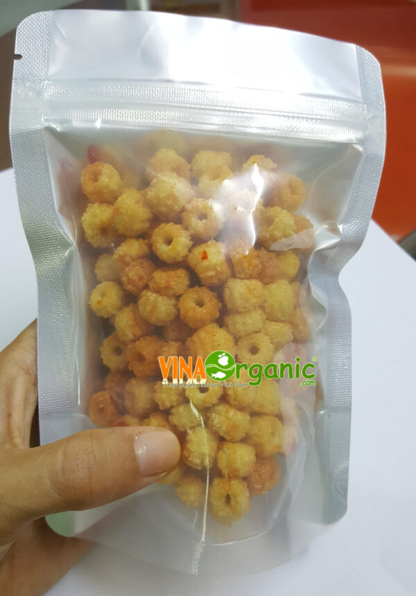 - Cấu trúc: Hạt khô đều, giòn tan khi cắn trong miệng. Lớp áo gia vị giòn xốp bọc đều xung quanh Nui rất bắt mắt