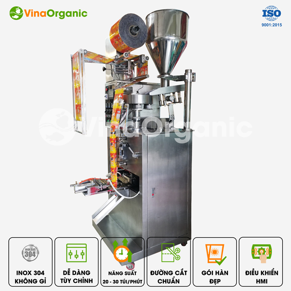 Máy đóng gói hạt tự động VinaOrganic với thiết kế đơn giản và thông minh, giúp nhà sản xuất tiết kiệm thời gian đóng gói, chi phí nhân công. Nhờ đó làm giảm chi phí sản xuất và tăng năng suất sản phẩm. Máy có cấu tạo chính bao gồm các bộ phận chính: bảng điều khiển, cuộn bao bì đóng gói, phễu chứa, ngàm ép, bánh xe di chuyển,…