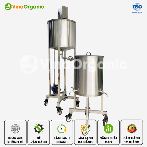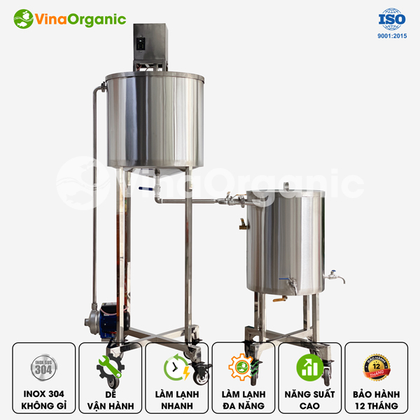 Thiết bị làm lạnh nhanh 100L được làm hoàn toàn từ inox 304, có cấu tạo bao gồm các bộ phận chính sau đây: Bồn cao vị, bồn làm lạnh, động cơ cánh khuấy, hệ thống ống xoắn, đường ống dẫn, bơm đầu inox, vòi chiết rót và bánh xe chịu lực,…