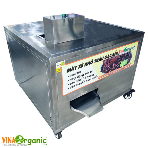 Đây là thiết bị xé khô trâu đời đầu của VinaOrganic, nhưng chúng tôi đã thiết kế máy với kích thước gọn nhất. Bên dưới là bánh xe, giúp dễ dàng di chuyển. Bên trên là cửa cho khô trâu vào, cửa đưa thịt trâu sau khi xé đặt ở vị trí 3/4 của máy, vị trí các cửa được thiết kế phù hợp, giúp việc cho và lấy sản phẩm dễ dàng hơn. Động cơ vận hành liên tục, giúp thịt xé nhanh, đều hơn và không bị nát, mang đến hiệu quả kinh tế cao.
