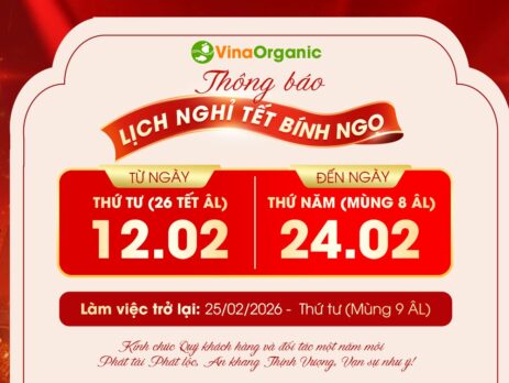 VinaOrganic xin được gửi lời tri ân sâu sắc đến Quý Khách hàng và Đối tác thân thiết – những người đã luôn tin tưởng, đồng hành cùng chúng tôi trong một năm vừa qua. Nhân dịp Tết Nguyên Đán 2026, kính chúc Quý khách hàng một năm mới Sức khỏe dồi dào – Vạn điều như ý! VinaOrganic gửi đến bạn lịch nghỉ Tết nguyên đán 2026 như sau: